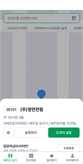 • 1. 검색창에 참가기업명 입력 후 도착 버튼 클릭