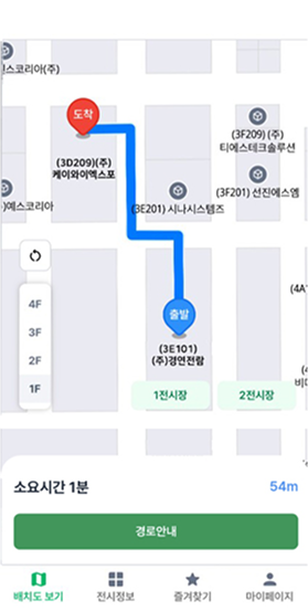 • 2. 현재 내 위치 근처 부스를 출발지로 설정하고 ‘경로 안내’ 버튼 클릭